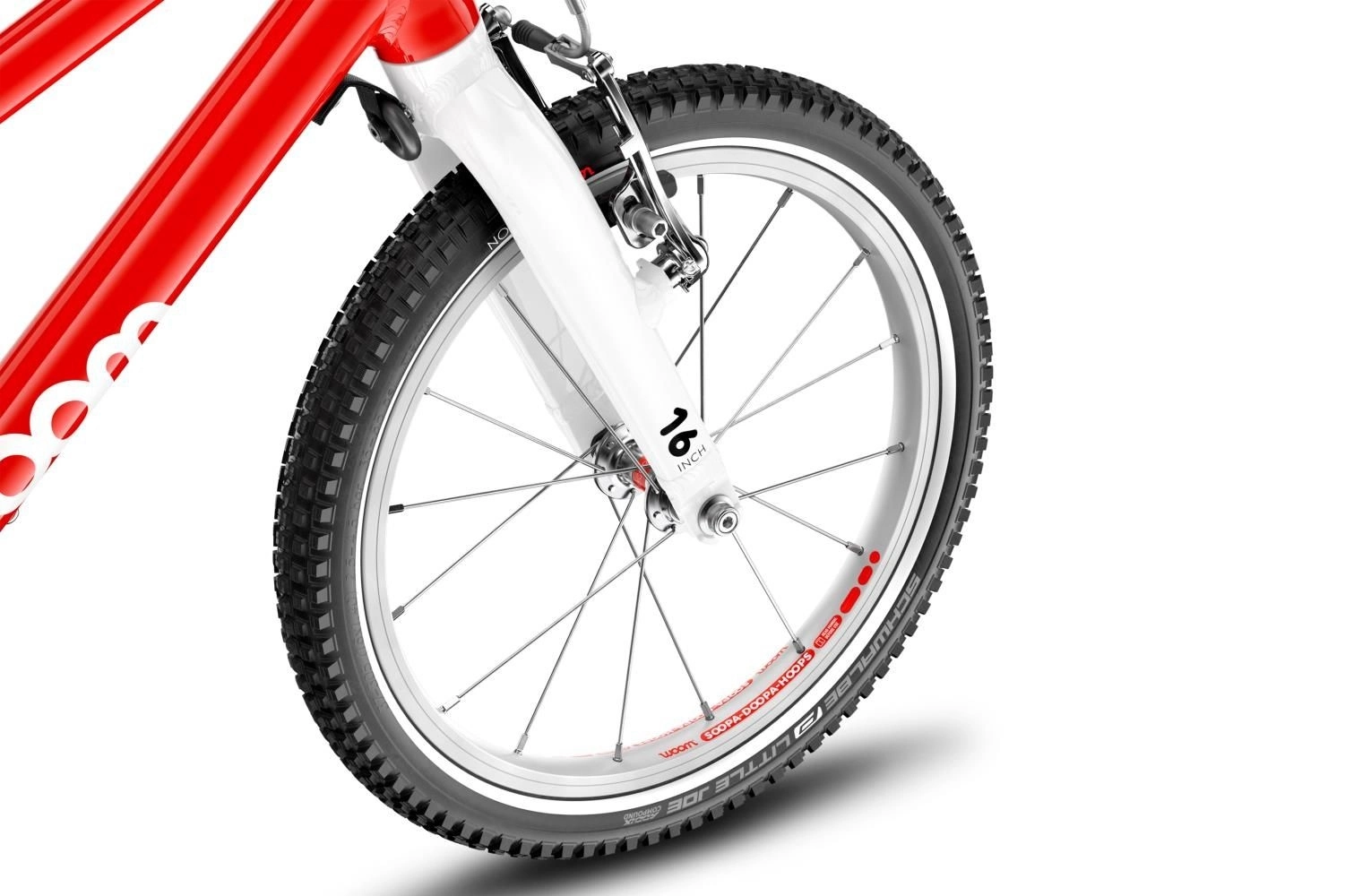 Allt rullar på ett stabilt hjulset med ultralätta aluminiumfälgar som i sin tur är försedda med ett par greppsäkra kvalitetsgummin (16-tummar) som levererar lågt rullmotstånd och pålitlig kurvtagning. När det väl blir dags att sakta ner farten så hanteras detta av ett par pålitliga v-bromsar som inte kräver mer bromskraft än vad lite mindre barn kan prestera. Bromsarna är smart färgkodade och inkluderar lätthanterliga reglage med smidig justering av räckvidden, som ser till att de passar även mindre händer. Vilket i praktiken ser till att du som förälder kan vara säker på att rätt bromsförmåga alltid finns på plats, oavsett vilka förhållande som råder för dagen. Även handtagen är ergonomiskt utformade och har en diameter som är fullt anpassad för små händer med lite kraftigare styrändar som ger extra skydd och minskar risken för att cyklisten ska behöva tappa greppet.