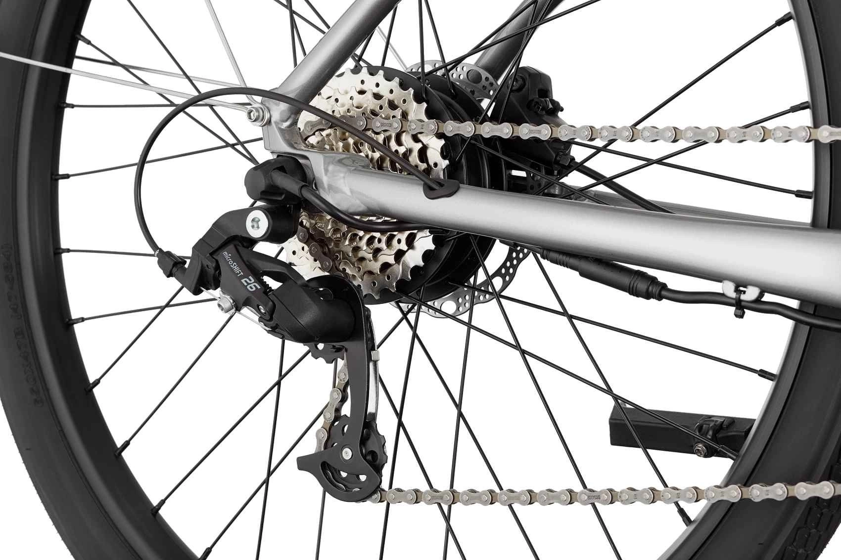 Motorn samarbetar fint med de 8 utanpåliggande växlarna från microSHIFT (M26S) med en utväxling (38Tx11-34T) vilket ser till att du utan problem kan hänga med både i varierande tempon och smärtfritt kan trampa på även i riktigt branta uppförsbackar. Växlarna styrs via ett lätthanterligt reglage som ger dig möjligheten att problemfritt skifta mellan växlarna utan att det känns det minsta ansträngt. Den totala körsträckan beror på en rad olika faktorer (som t ex vägförhållanden, assistansläge, passagerarvikt, lufttryck etc) men en räckvidd på upp till 75 km är fullt möjligt, och det räcker nog gott åt de allra flesta.