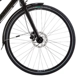 De tåliga hjulen med förstärkta ekrar har Nishiki´s egenutvecklade asymmetriska fälgar som gör hjulen starkare genom att jämna ut ekerspänningen mellan höger och vänster sida. På hjulen sitter ett par kvalitetsgummin från Schwalbe med 37mm bredd och punkteringsskydd, vilket ser till att cykeln faktiskt även klarar lite lättare terrängkörning. En cyklande zenbuddhist skulle nog kalla storleken för den ”gyllene medelvägen”… kör du med lite lägre lufttryck så höjer du komforten och uppnår bättre skydd mot vassa föremål och grus, allt för att du ska få så bekymmersfri cykling som möjligt (främst på lösare underlag). Håller du däcken väl pumpade så står de pall för det mesta och du får en fantastiskt lättrullande cykel (främst på hårdare underlag) som gör dig lika glad varje gång du trampar iväg från klungan.