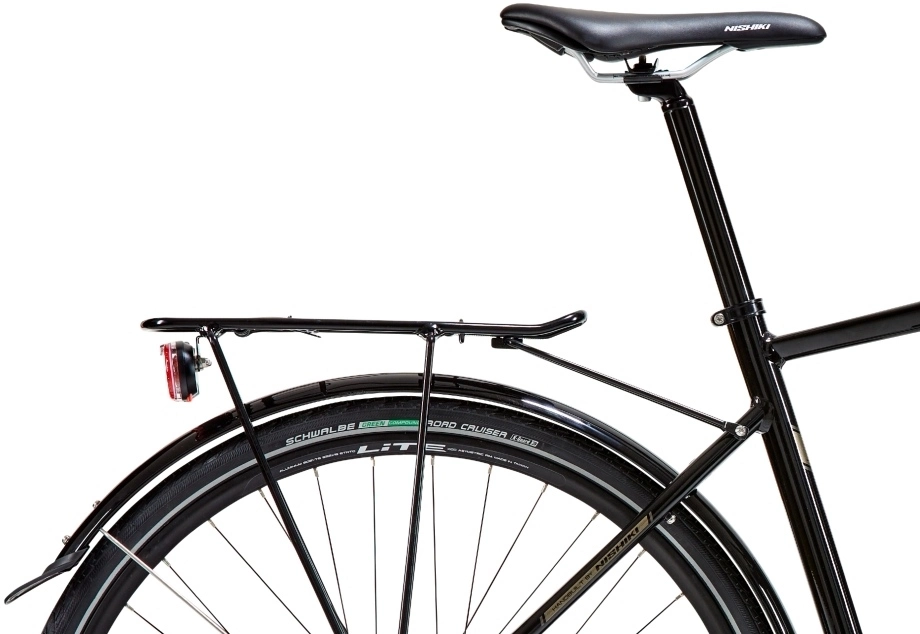 De tåliga hjulen med förstärkta ekrar har Nishiki´s egenutvecklade asymmetriska fälgar som gör hjulen starkare genom att jämna ut ekerspänningen mellan höger och vänster sida. På hjulen sitter ett par kvalitetsgummin från Schwalbe med 37mm bredd och punkteringsskydd, vilket ser till att cykeln faktiskt även klarar lite lättare terrängkörning. En cyklande zenbuddhist skulle nog kalla storleken för den ”gyllene medelvägen”… kör du med lite lägre lufttryck så höjer du komforten och uppnår bättre skydd mot vassa föremål och grus, allt för att du ska få så bekymmersfri cykling som möjligt (främst på lösare underlag). Håller du däcken väl pumpade så står de pall för det mesta och du får en fantastiskt lättrullande cykel (främst på hårdare underlag) som gör dig lika glad varje gång du trampar iväg från klungan.