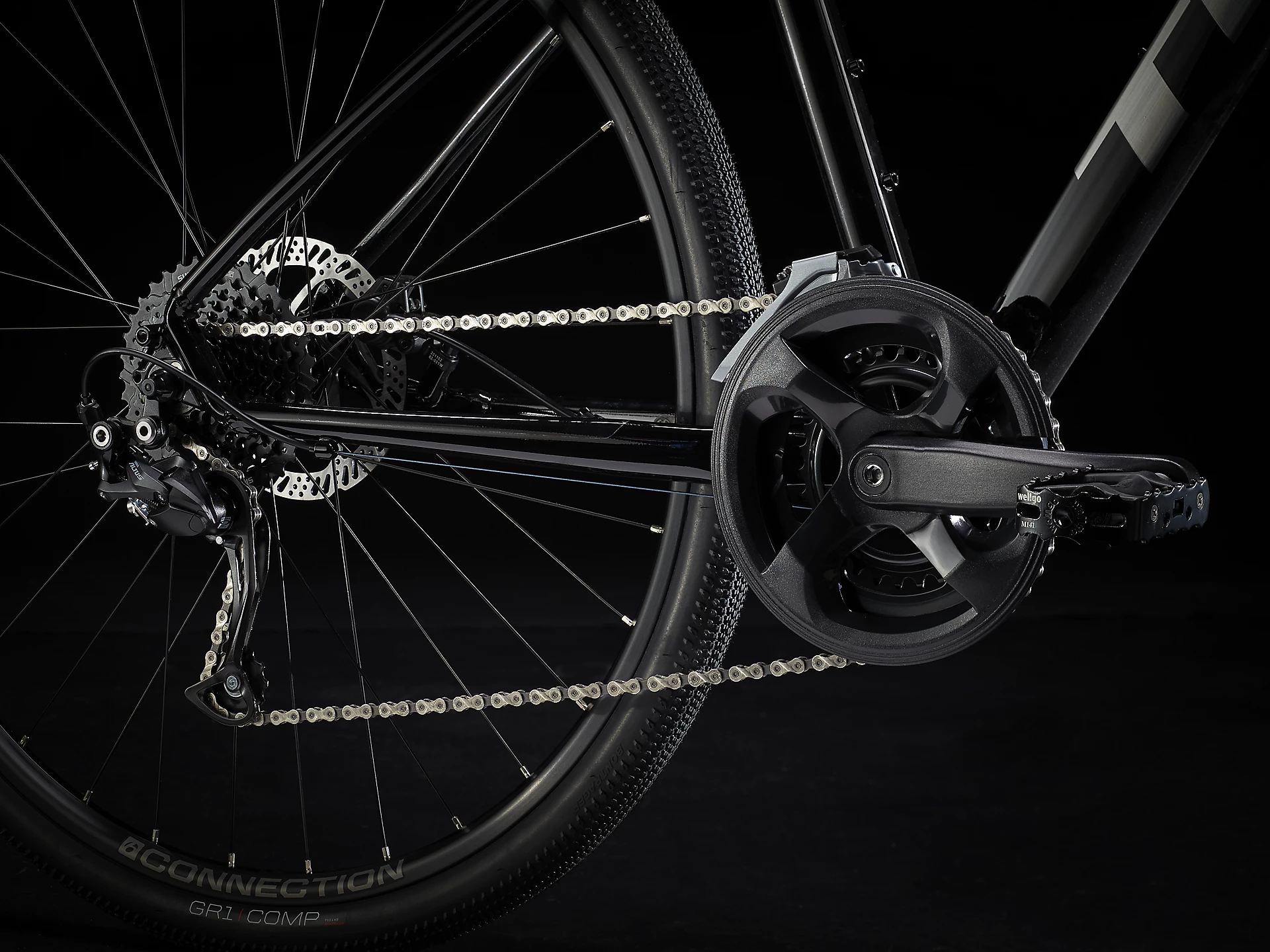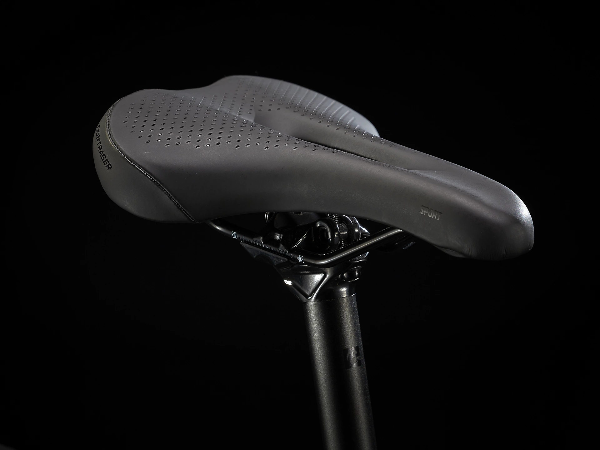 Det rejäla hjulsetet består av robusta aluminiumfälgar och greppsäkra gummin från Bontrager (GR1 Comp) med robust punkteringsskydd som hanterar allt från slät asfalt till ojämna grusvägar. Dessa breda (40 mm) däck ger dig den perfekta kombinationen av grepp, komfort och stabilitet, vilket i praktiken innebär ökad trygghet när terrängen börjar bli lite besvärligare. Framtill hittar du en dämpad framgaffel från SR Suntour (NEX) som har 63 mm i slaglängd. Gaffeln har ställbar spiralfjädring och dessutom lockout vilket säkerställer att du alltid cyklar effektivt: du kan enkelt låsa dämparen när du kör på slät asfalt och öppna den när det ojämna underlaget kräver det.