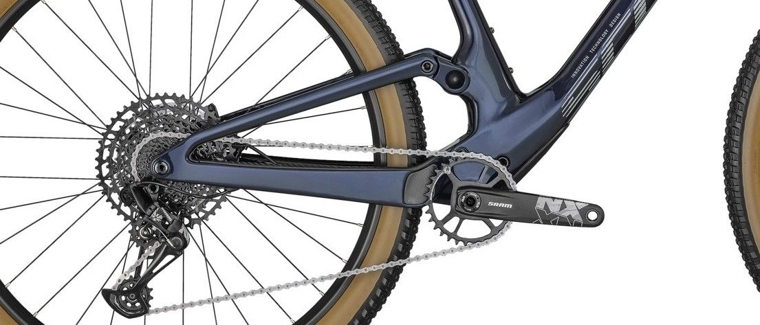 Utöver en helt unik dämpning och en klassledande kolfiberram så har den en slagkraftig drivlina med 12 växlar från SRAM (NX Eagle) som levererar driftsäker prestanda i form av en modern 1x-drivlina med smidig funktion och ett brett register (32Tx11-50T). Drivlinan styrs från en slimmad cockpit med både styre och styrstam från Syncros som har fullt integrerad kabeldragning och imponerande hög kompatibilitet med olika tillbehör från Syncros, Garmin och GoPro (datorer, GPS:er, lampor, kameror etc). Drivlinans kedjelinje på 55 mm medger dels att du kan köra med extremt breda däck men även att du kan montera ett 40-tandat framtill (om nu någon utom Nino fixar att nyttja den utväxlingen). Det är hög klass även på övriga komponenter och cykeln har en välbalanserad mix av prylar som hämtats direkt från de övre hyllorna hos både FOX, SRAM, Shimano och Syncros.